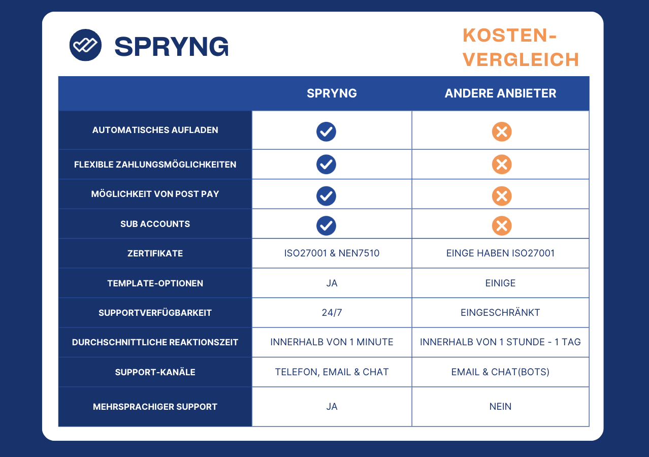 Durch eine transparente Preisgestaltung, das Fehlen versteckter Kosten und einen rund um die Uhr verfügbaren (kostenlosen) Support und Kundendienst ermöglicht Spryng Unternehmen, die Herausforderungen von SMS mit Vertrauen und Klarheit zu meistern.