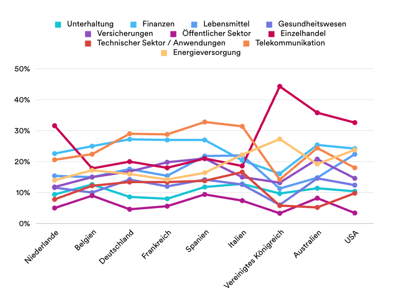 Die sich entwickelnde Landschaft der Verbraucherbedürfnisse wird jedoch nicht nur durch die Technologie beeinflusst, sondern auch durch andere Faktoren wie steigende Zinssätze, politische Probleme und deren Folgen: steigende Energiepreise, führten zum Beispiel zu einem erhöhten Bedürfnis der Verbraucher zur Kontaktaufnahme mit Finanzinstituten und Versorgungsunternehmen. Der Finanzsektor ist mit einem Anteil von 25 % der am häufigsten kontaktierte Sektor in Belgien. Dieser Trend spiegelt sich in mehreren Ländern wider, in denen Finanzinstitute zu der am zweithäufigsten kontaktierten Branche gehören. In den Niederlanden (22,6 %), Deutschland (27,2 %), Frankreich (27 %), Spanien (27 %), Australien (25,4 %) und den USA (24,2 %) zum Beispiel, suchen die Verbraucher häufig Kontakt zu Finanzinstituten.
