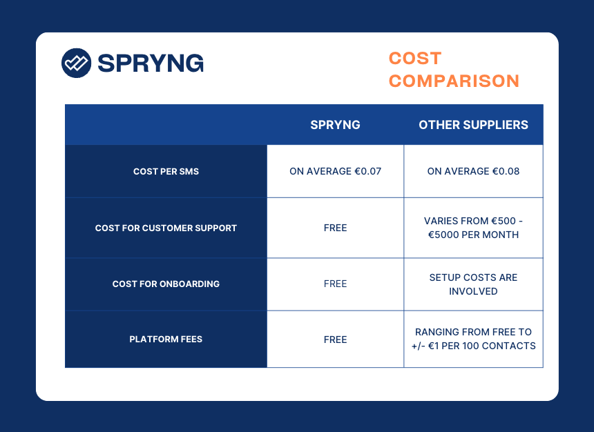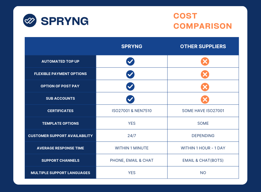 It’s sometimes hard to decide what to keep in mind when you’re comparing SMS providers. At Spryng, we value transparency and our motto is “what you see, is what you get!”. In this article, we therefore want to clarify what you should consider when you are comparing suppliers. Don’t be taken by surprise and ask carefully what costs will be added. After all, not all suppliers are so transparent about the costs you have to pay. In this article, we will give you a hand.