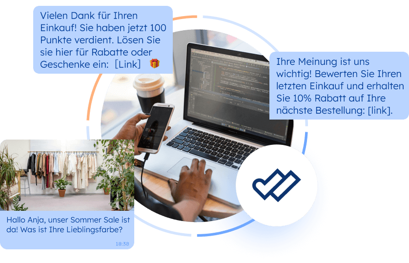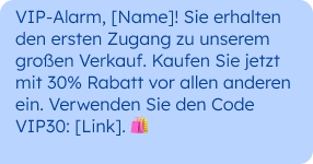 Beispiele für SMS Marketing sind das Versenden von Werbeangeboten wie Sonderrabatten oder Verkaufsveranstaltungen, um Kunden anzulocken und zum Kauf zu animieren. Veranstaltungserinnerungen per SMS können Kunden über bevorstehende Veranstaltungen informieren, was zu mehr Besuchern führen kann. Personalisierte Rabatte können auf die individuellen Kundenpräferenzen und die Kaufhistorie zugeschnitten werden, wodurch Relevanz und Konversion erhöht werden. Einige Marketingfachleute sind der Meinung, dass Verbraucher nicht empfänglich für SMS Marketingbotschaften sind, aber eine aktuelle Studie von Commify hat ergeben, dass Verbraucher SMS Marketing im Allgemeinen positiv gegenüberstehen – solange die Nachrichten relevant sind (z. B. basierend auf der Kaufhistorie). Lesen Sie unbedingt unseren Blogbeitrag „First-Party-Datenmarketing: SMS- und WhatsApp-Strategien für moderne Marketingfachleute“, um weitere Tipps und Ideen zum SMS Marketing zu erhalten.