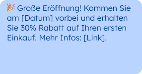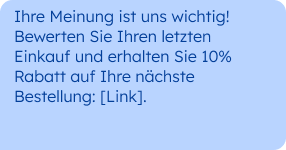 Mit einer durchschnittlichen Öffnungsrate von 98% wird eine SMS viermal häufiger geöffnet als eine E-Mail. Dies bietet eine fantastische Gelegenheit, mit Ihren Kunden auf einer persönlichen Ebene in Kontakt zu treten. Der Versand von Marketing- und Werbe-SMS kann eine großartige Möglichkeit sein, treue Kunden zu belohnen und gleichzeitig potenzielle Kunden zu dem so wichtigen Erstkauf zu ermutigen.